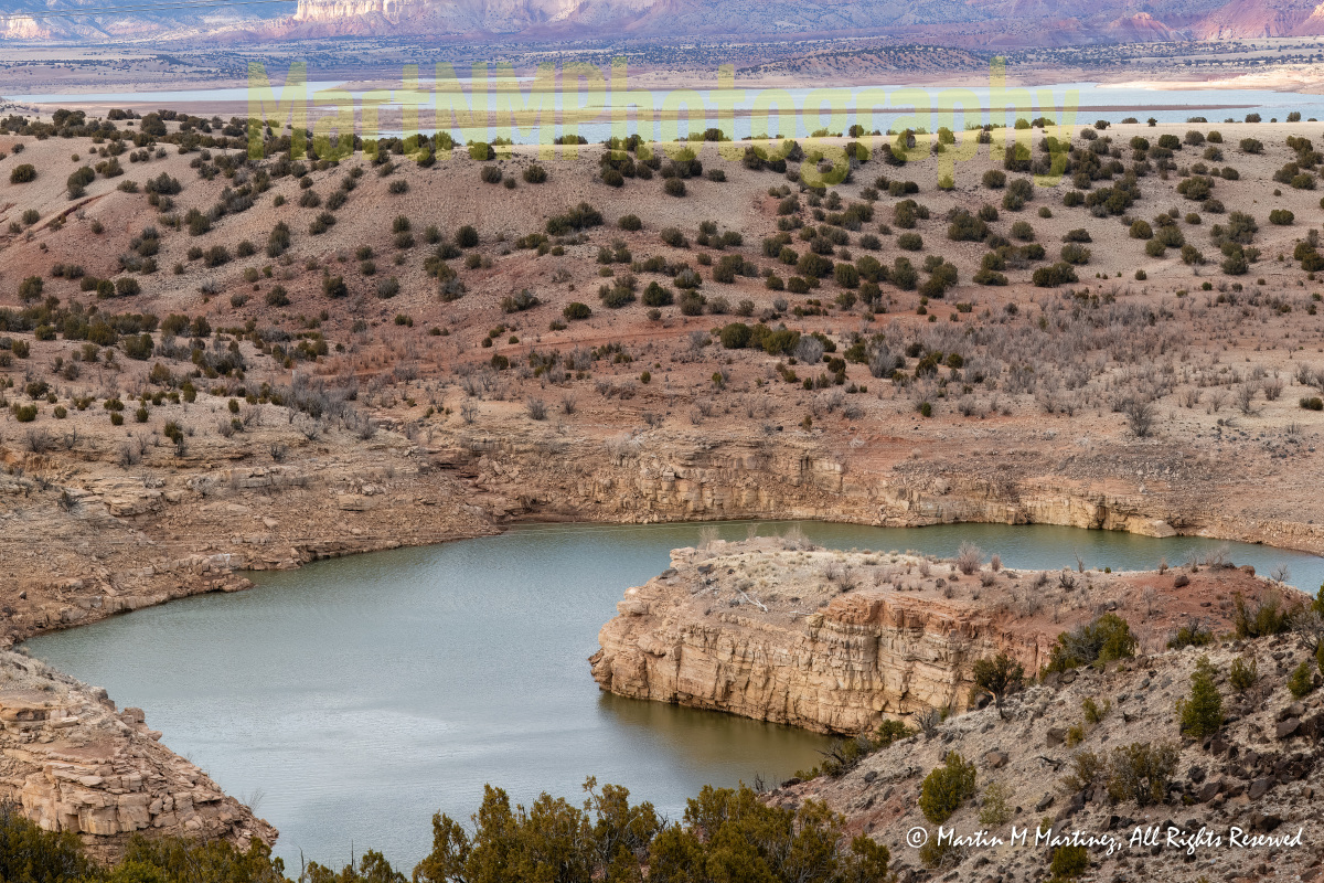 The cove, edged by towering red rocks and jagged limestone, is a secluded campground for visitors to the Abiquiu Reservoir.