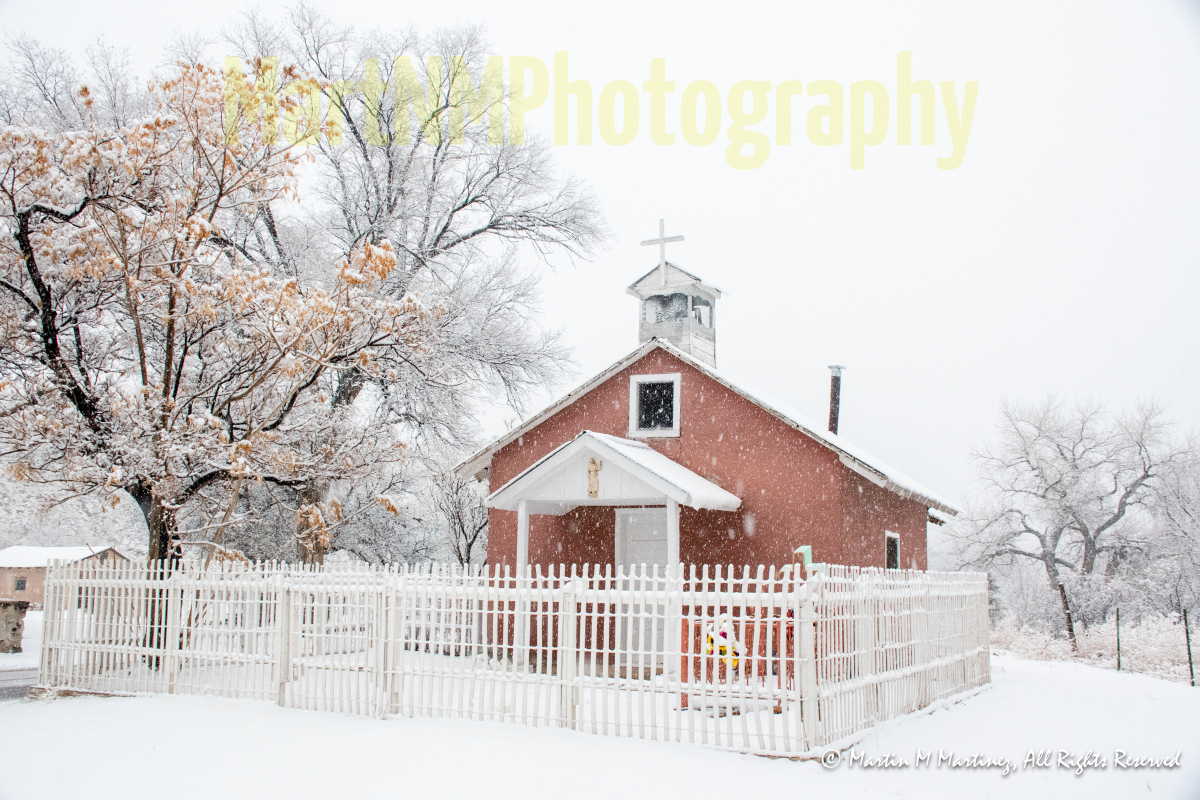 Captured during a winter storm, this photograph showcases a chapel in Estaca, New Mexico.