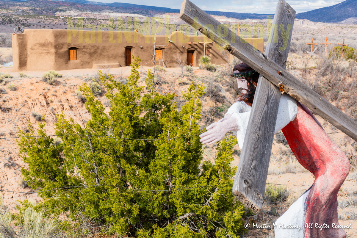 A statue of Jesus Christ carrying a cross can be found in the southern hills of Abiquiu, next to a religious Catholic sanctuary.